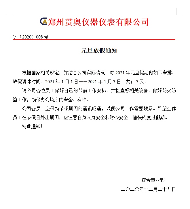 2021年元旦佳節將至,首先向全體員工致以節日的問候,為了大家能度過歡樂、祥和、平安的節日,特提醒全體人員注意以下幾點: