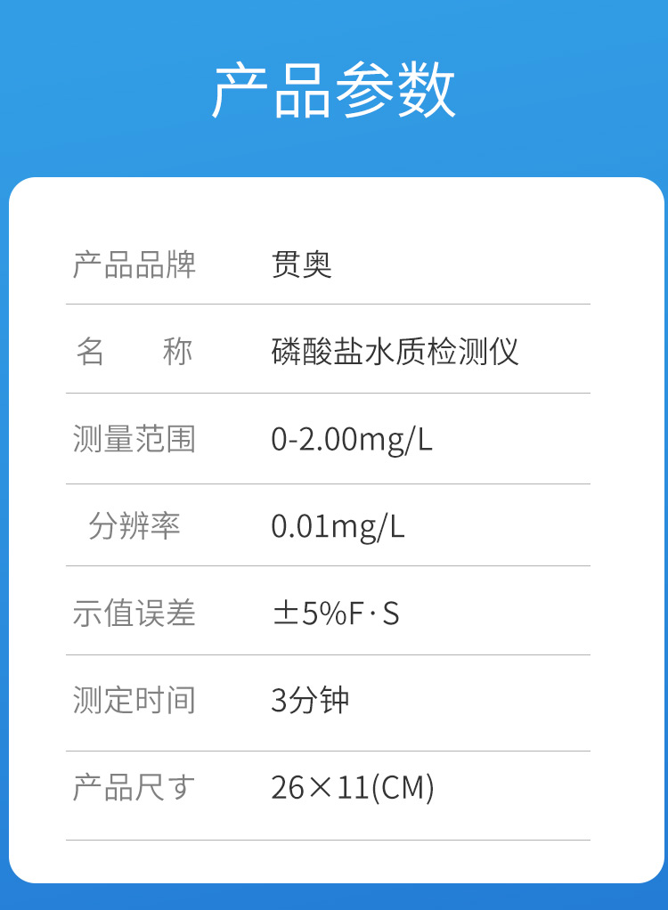 | 1 | 磷酸鹽 | 0~2.00mg/L | Ⅰ、Ⅱ、Ⅲ | 0.01mg/L | ±5%F·S |